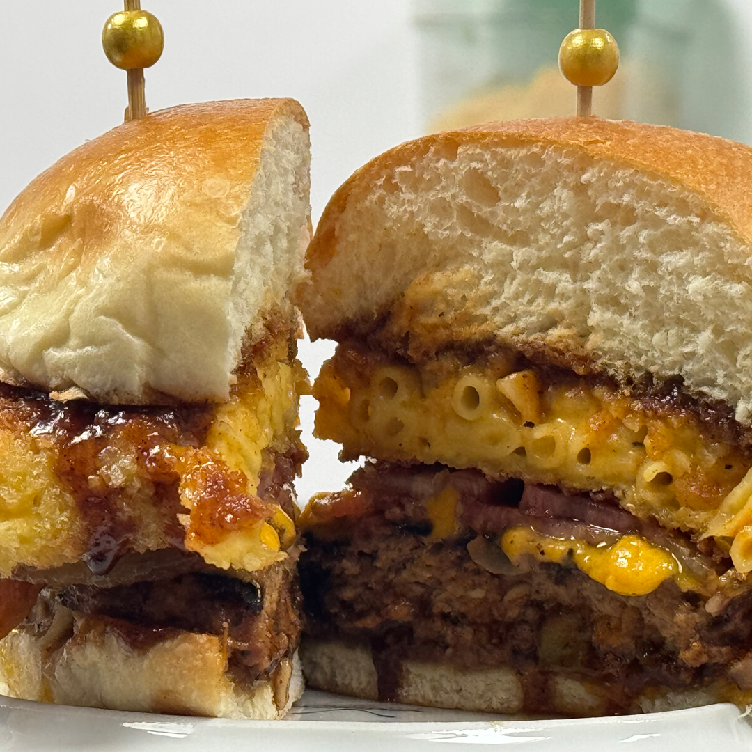 A 6 oz House-Made Angus Beef Patty topped with a Crispy Smoked Gouda Mac n Cheese Patty and Double Smoked Bacon served on a Cobs Gourmet Bun with Tangy BBQ Sauce.