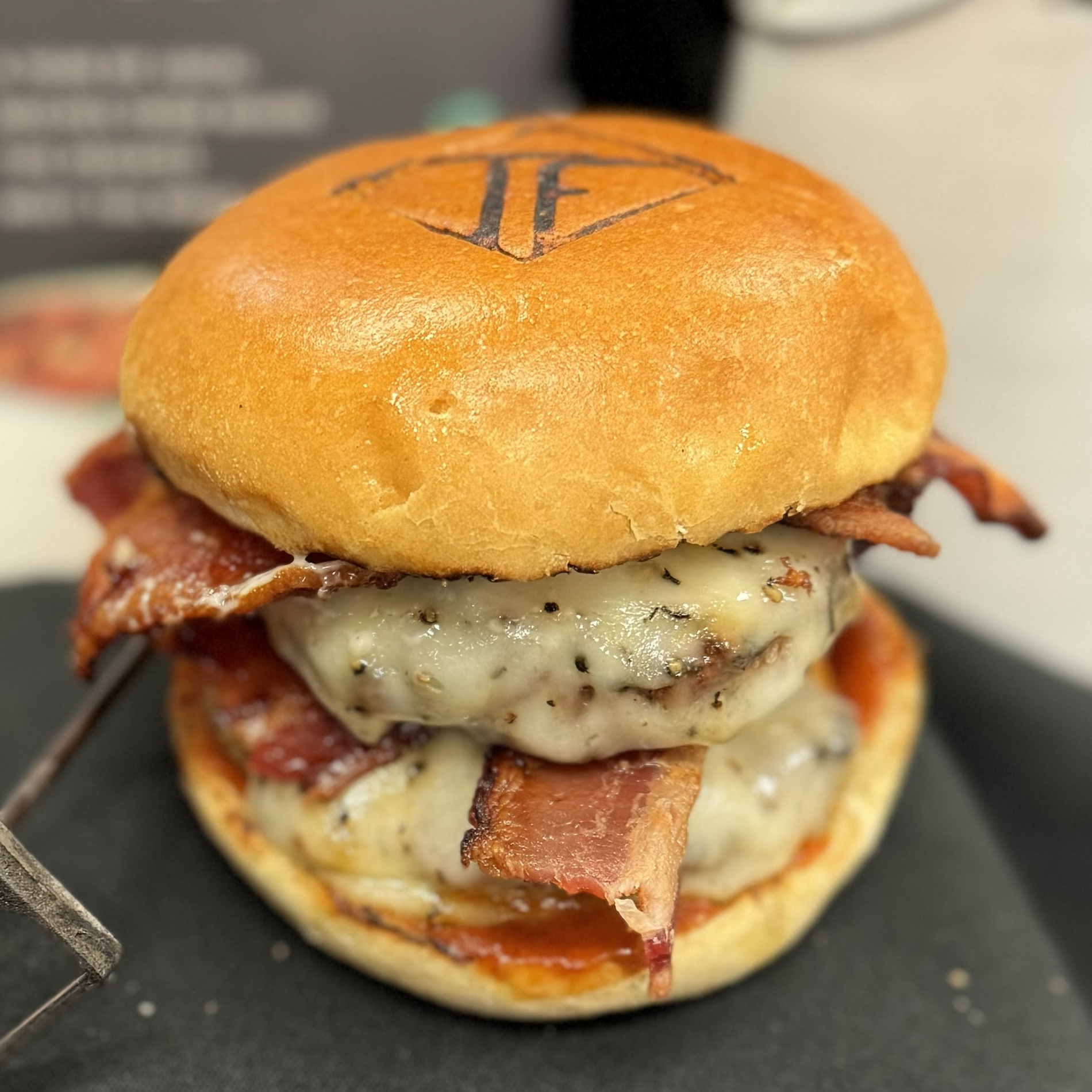 Two Canadian Beef Patties, Melted Cheese and Bacon served on a Toasted Twisted Forks Bun.
