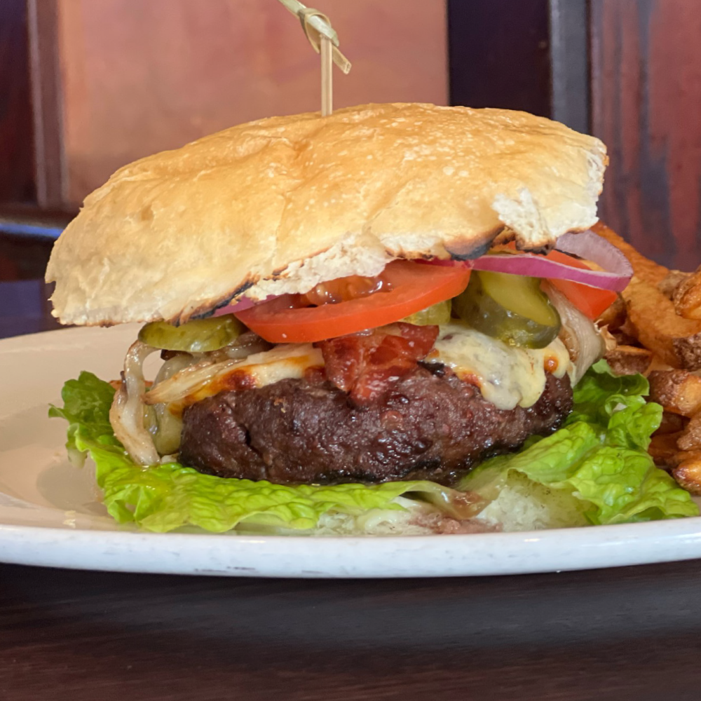 An 8 oz Flame-Broiled House Ground 100% Alberta Beef Patty, House-Cured Maple Bacon, Sautéed Gourmet Oyster Mushroom, House Cheese Blend, Mayo, Tomato, Onion, Kale, and Pickle served on a House Baked Bun. Gluten-Free Bun available.
