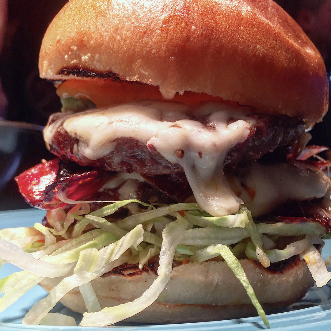 Two 4 oz Canadian Beef Patties, Aged Cheddar Cheese Curds, Crushed Avocado, and Aji Aioli served on a Toasted Bun.