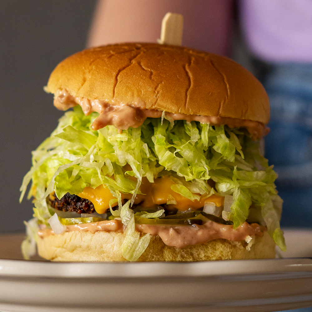 A Canadian Angus Beef Patty, Russian Dressing, American Cheddar, Iceberg Lettuce and Pickles served on a Martin's Potato Bun.
