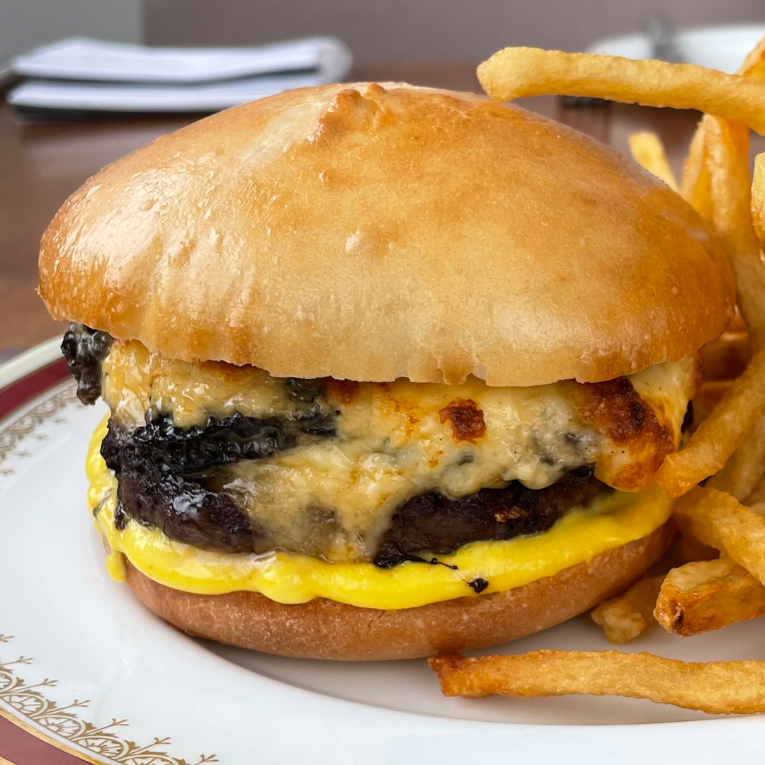 A Dry Aged Alberta Beef Patty, Morel Mushroom Ragú, and Gruyère served on a Toasted Bun.