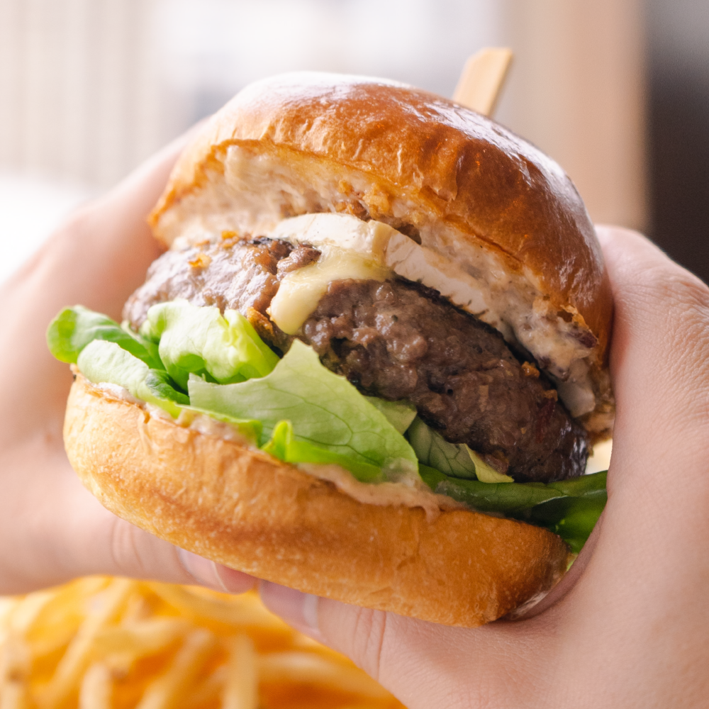 A Canadian Angus Beef Patty, Leaf Lettuce, Bacon Jam, Cambozola Cheese and Crispy Onions served on a Good Bread Brioche Bun.