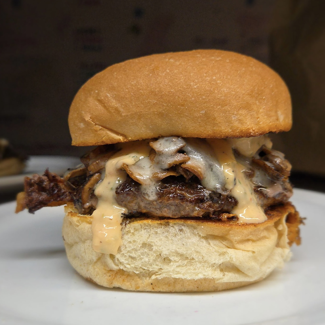 A 5 oz Canadian Beef Patty, Roasted Mushrooms, Local Gouda Cheese, and HLD Signature Burger Sauce served on a Vienna Bakery Bun.
