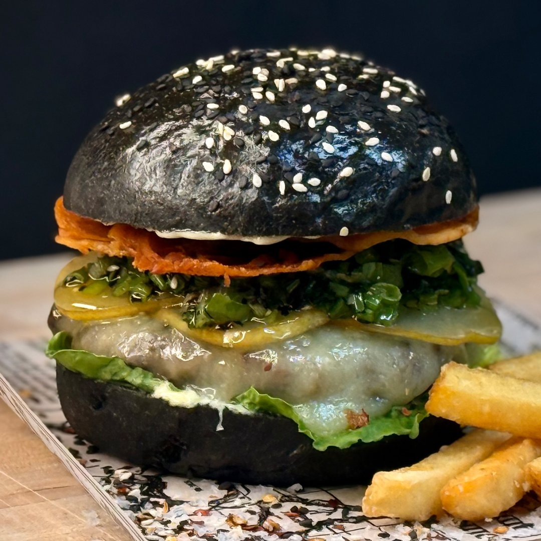 A Canadian Beef Patty, Green Onion Relish, Sesame Seeds, Lettuce, Tomato, and Cheese served on a Japanese Milk Bread Charcoal Bun.