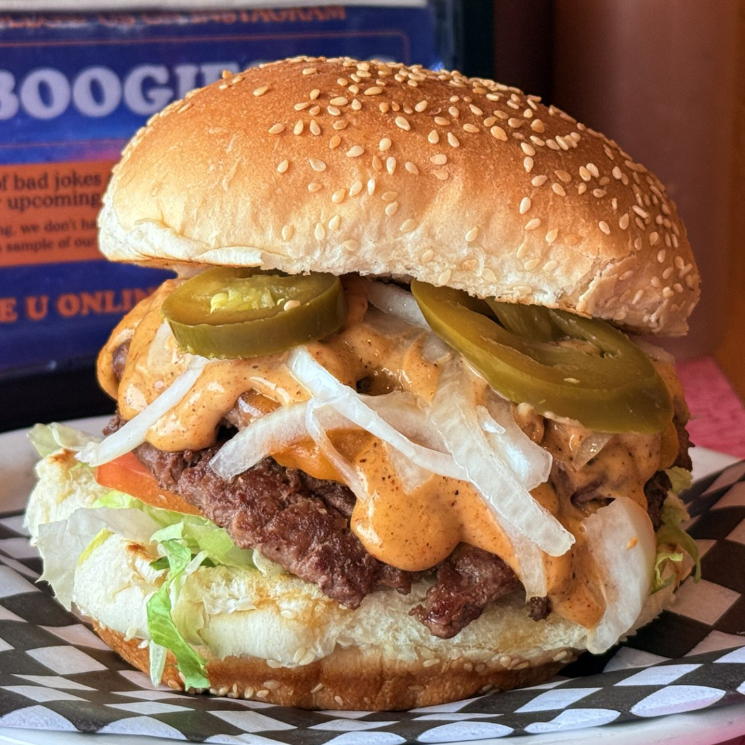 Two 4 oz Canadian Beef Patties, Santa Fe Mayo, Pickled JalapeƱos, Cheddar Cheese, Lettuce, Tomato, and Onion served on a warm, fresh Sesame Seed Bun.