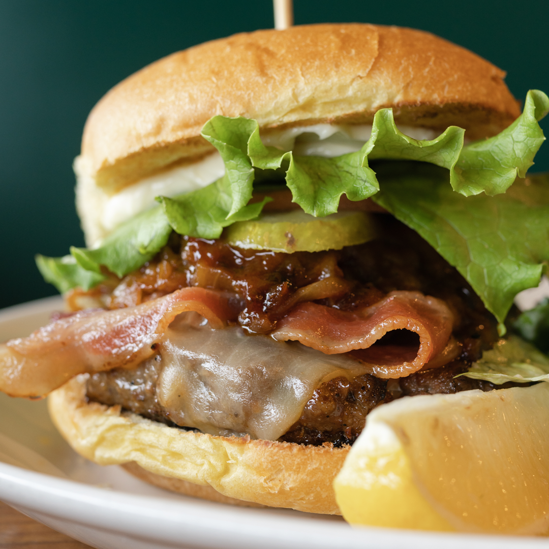 Our House-Made Canadian Beef patty topped with Smoked Cheddar Cheese, Bacon, Caramelized Onions, Kansas-Style BBQ Sauce, Lettuce, Tomato, Pickle and Mayo served on a Brioche Bun.