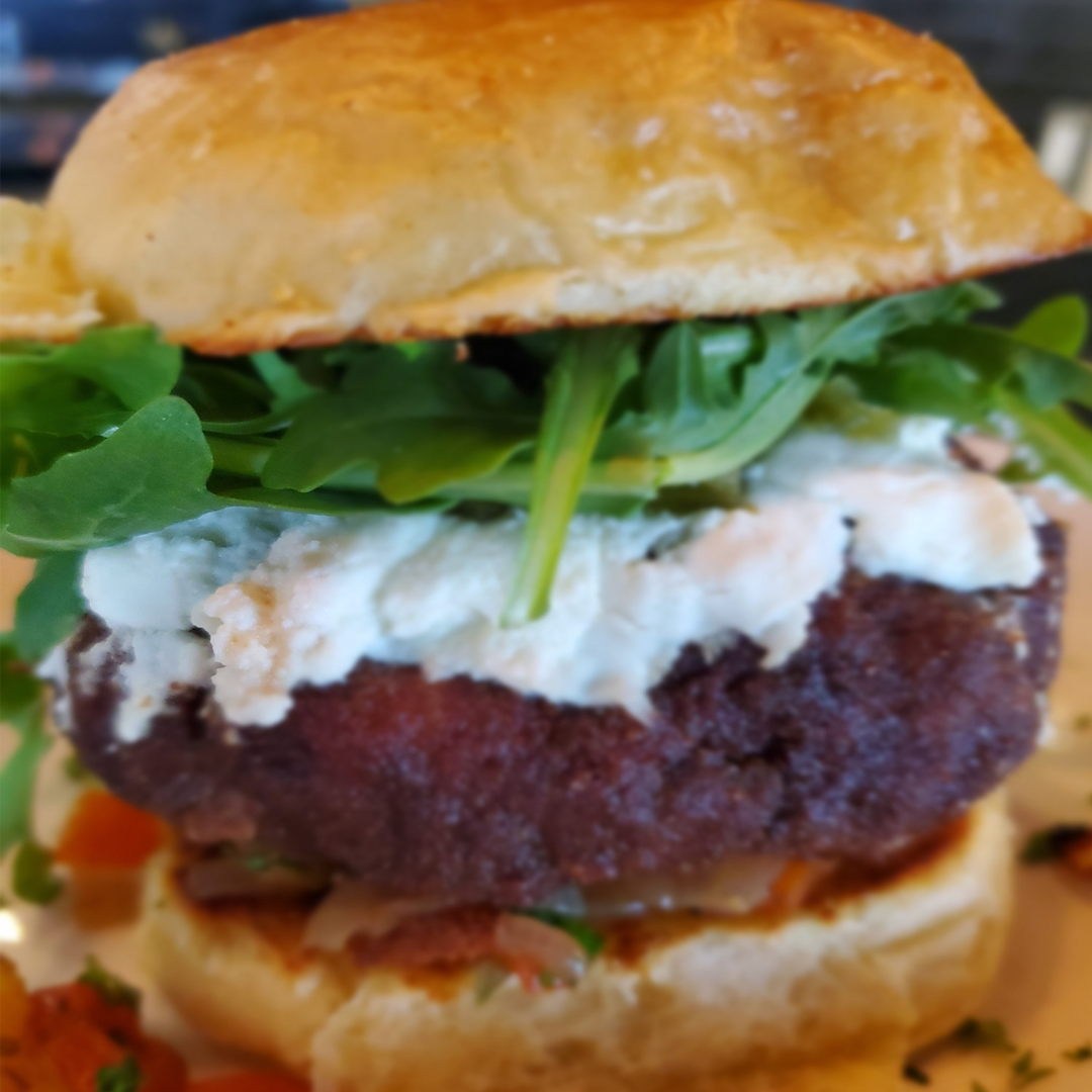 A 100% Canadian Beef Patty, JalapeƱos, Roasted Peppers, Cream Cheese, Mozzarella Cheese, Arugula, Tomato, Chipotle Lime Ranch Sauce, Eggs, Breadcrumbs, and Caramelized Onions served on a Homemade 'Dee's Baked Goods' Brioche Bun.