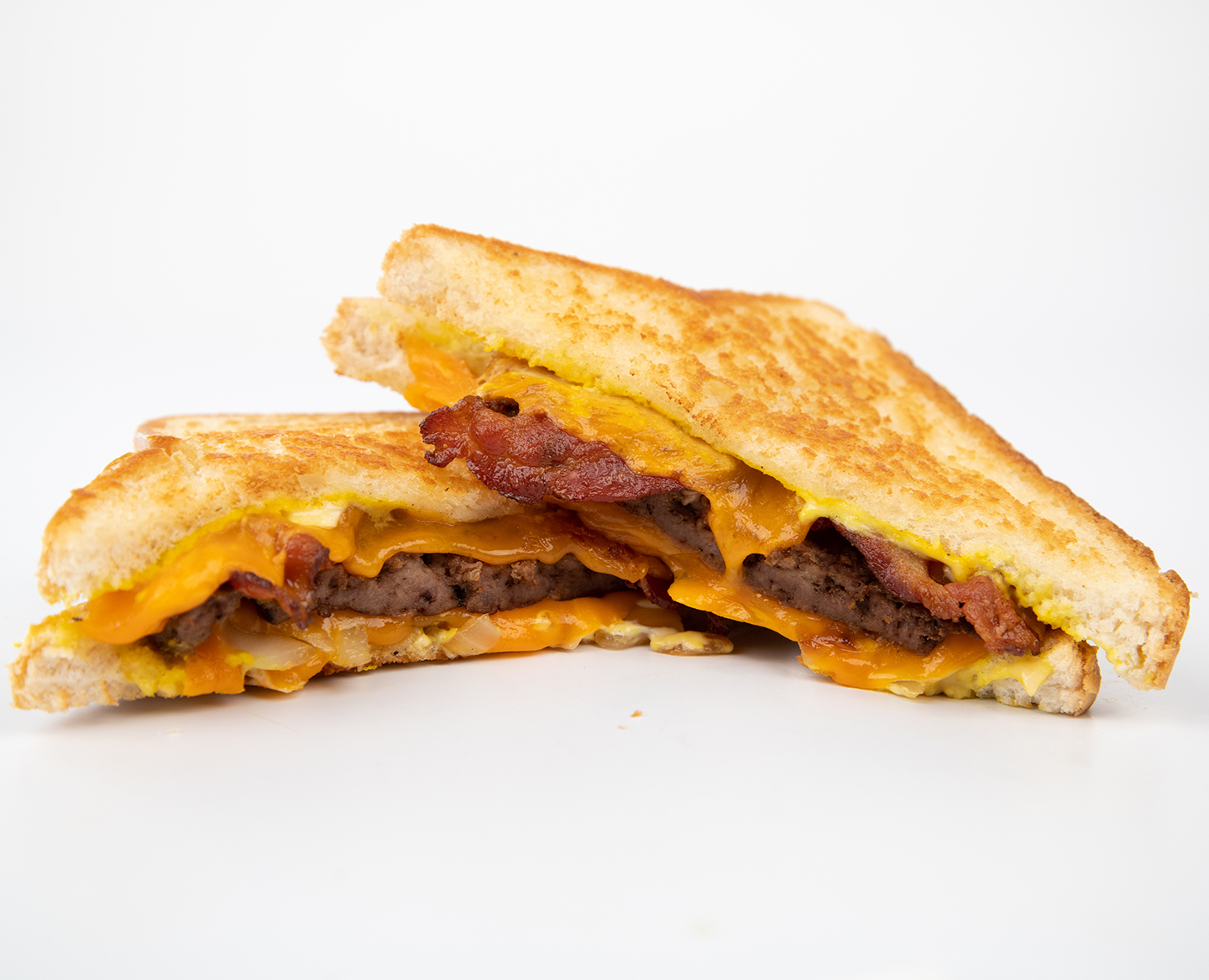 Galette de bœuf assaisonnée écrasée entre deux tranches épaisses de pain beurré grillé, garnie d’oignons sautés, de mayonnaise, de moutarde et de deux tranches de cheddar.