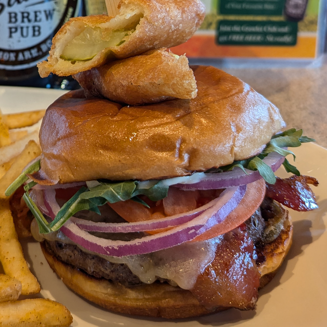 A 100% Canadian Beef Patty with White Cheddar, Maple Bacon Slices, Crispy Jalapeños, Garlic Mayo, Haskap BBQ Sauce, Forty Creek Sauce with an Arugula cover on a Brioche Bun topped with Our Beer-Battered Deep Fried Pickle.