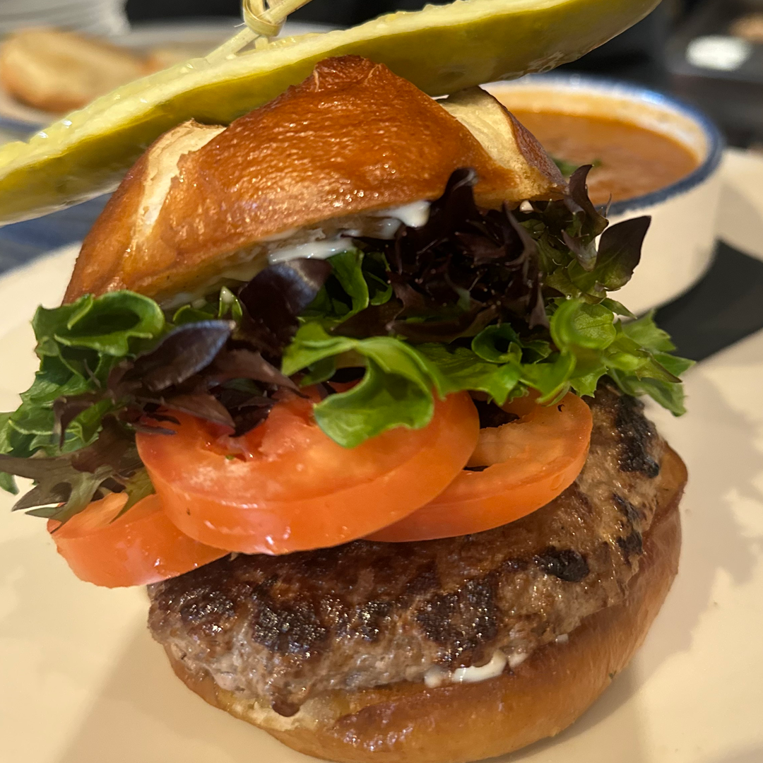 A Classic 6 oz Canadian Beef Burger Patty topped with Artisan Lettuce Mix, Tomato, Pickle Wedge and Dutch Mayonnaise served on a Grilled Pretzel Bun.