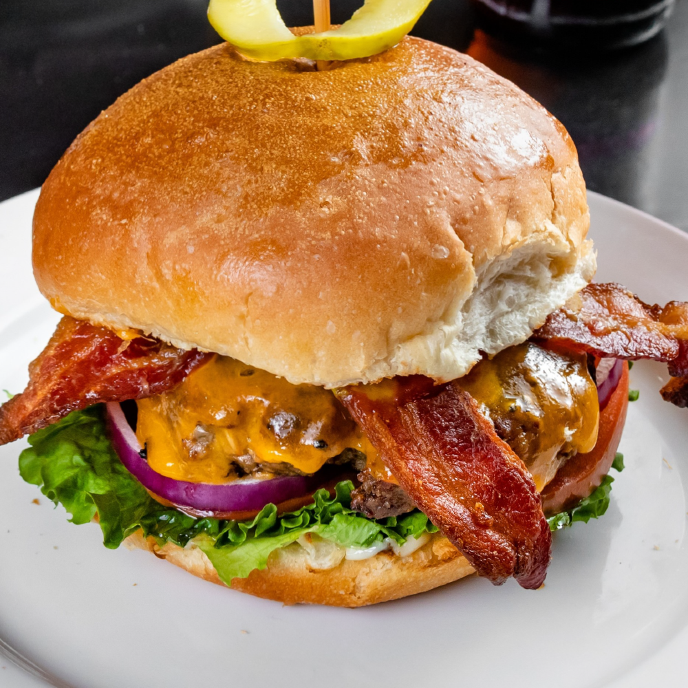 A Homemade 8 oz Canadian Beef Patty, Crisp Bacon, Cheddar Cheese, Lettuce, Tomato, Red Onion, House-Made Mayo, Mustard, Ketchup served on a Kaiser Bun with a Pickle Sail.
