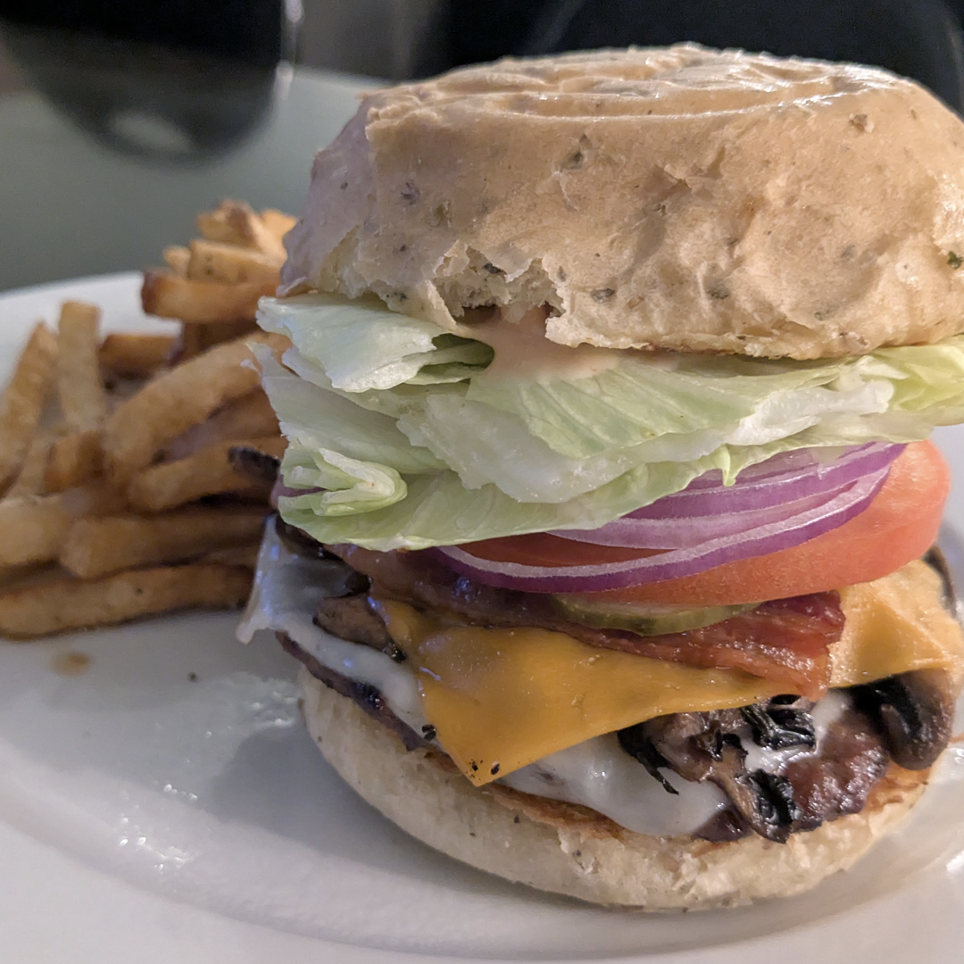 A 5 oz Hand-Formed All-Canadian Beef Patty topped with Bacon, Sautéed Mushrooms, Swiss and Cheddar Cheese, Crisp Lettuce, Red Onion, Tomato, Pickles, Our Home Recipe Burger Sauce, and Cajun Mayo served on a Focaccia Bun.