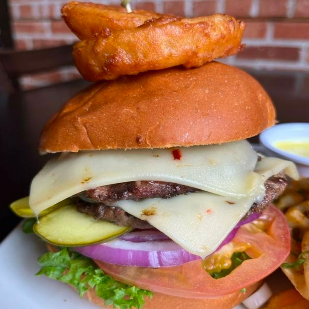 Two 4 oz 100% Canadian Beef Patties, JalapeƱo Jack Cheese, Irish BBQ Sauce, Lettuce, Tomato, Onion, Pickles, and House-Made Tipperary Sauce served on a Rustic Bun topped with 2 Guinness Onion Rings.