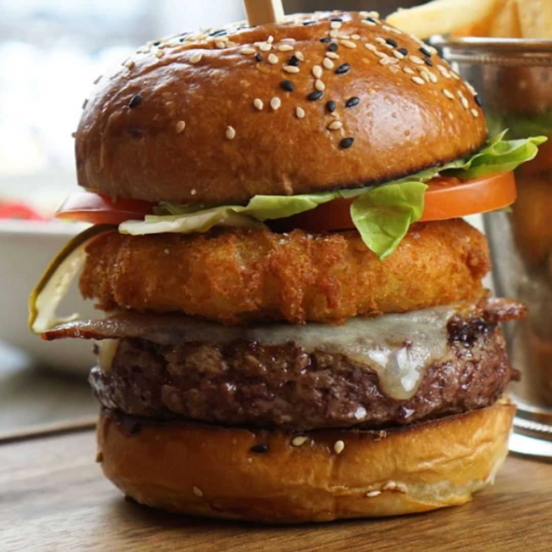 A Canadian Beef Patty topped with Crispy Bacon, Onion Ring, Old Cheddar, Lettuce and Tomato served on a Toasted Sesame Seed Bun.