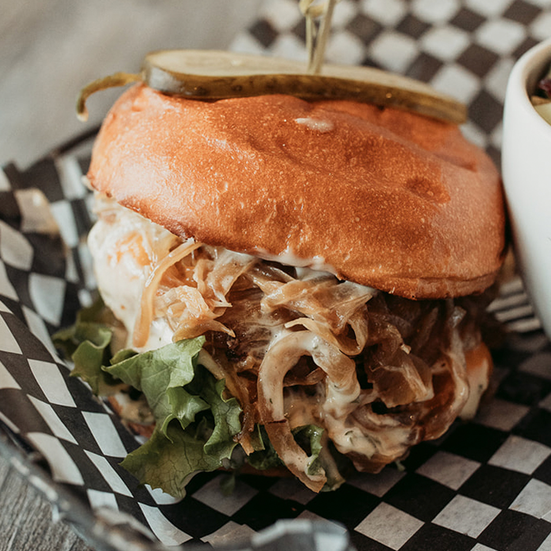 A 5 oz Hopcott Farms Prime Rib Patty, Cheddar Cheese, Caramelized Onions, Roasted Garlic Herb Aioli, Lettuce, and Tomato served on a Brioche Bun.