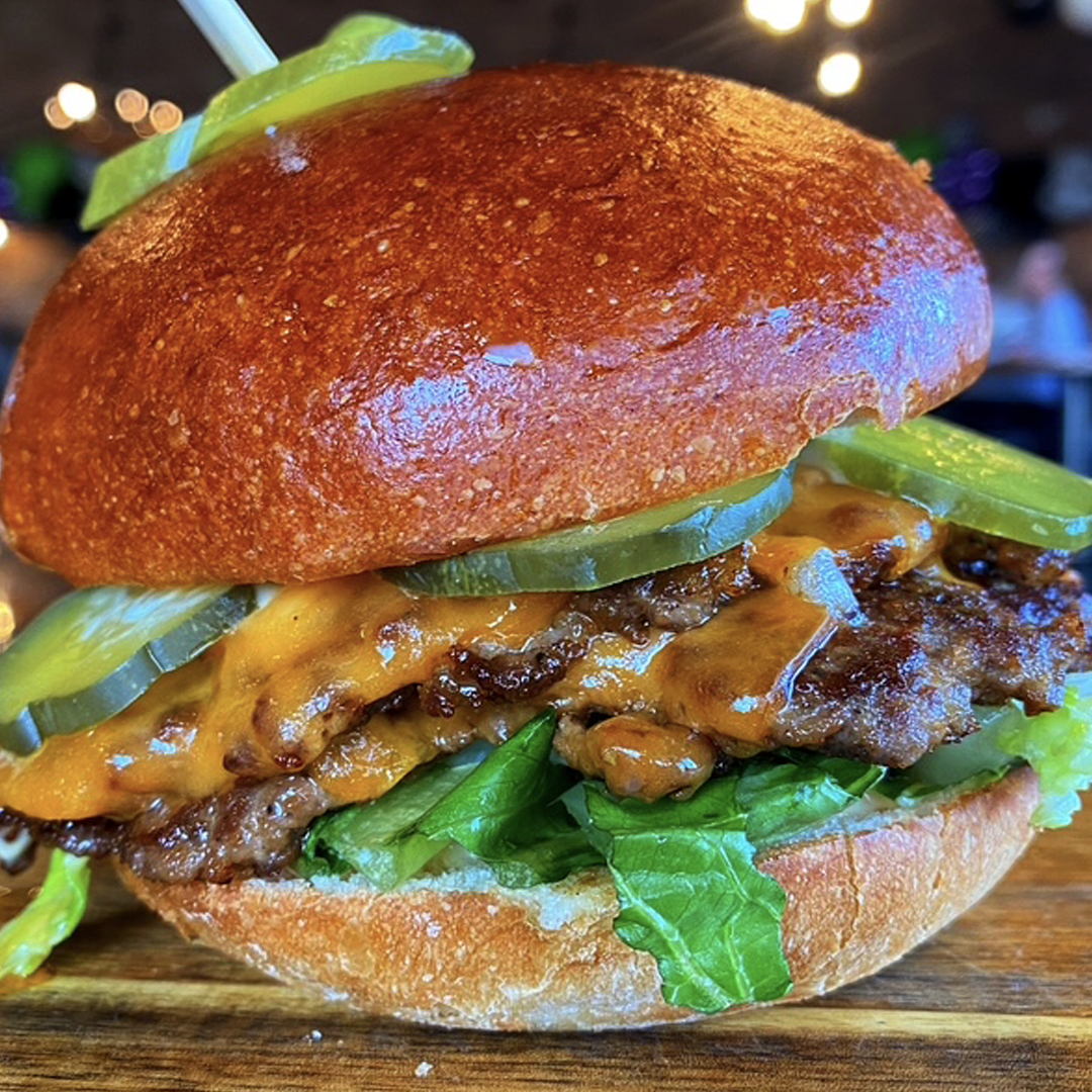 Two 3 oz Canadian Beef Patties, Cheddar Cheese, Lettuce, Pickles, and P&R Burger Sauce served on a Brioche Bun.