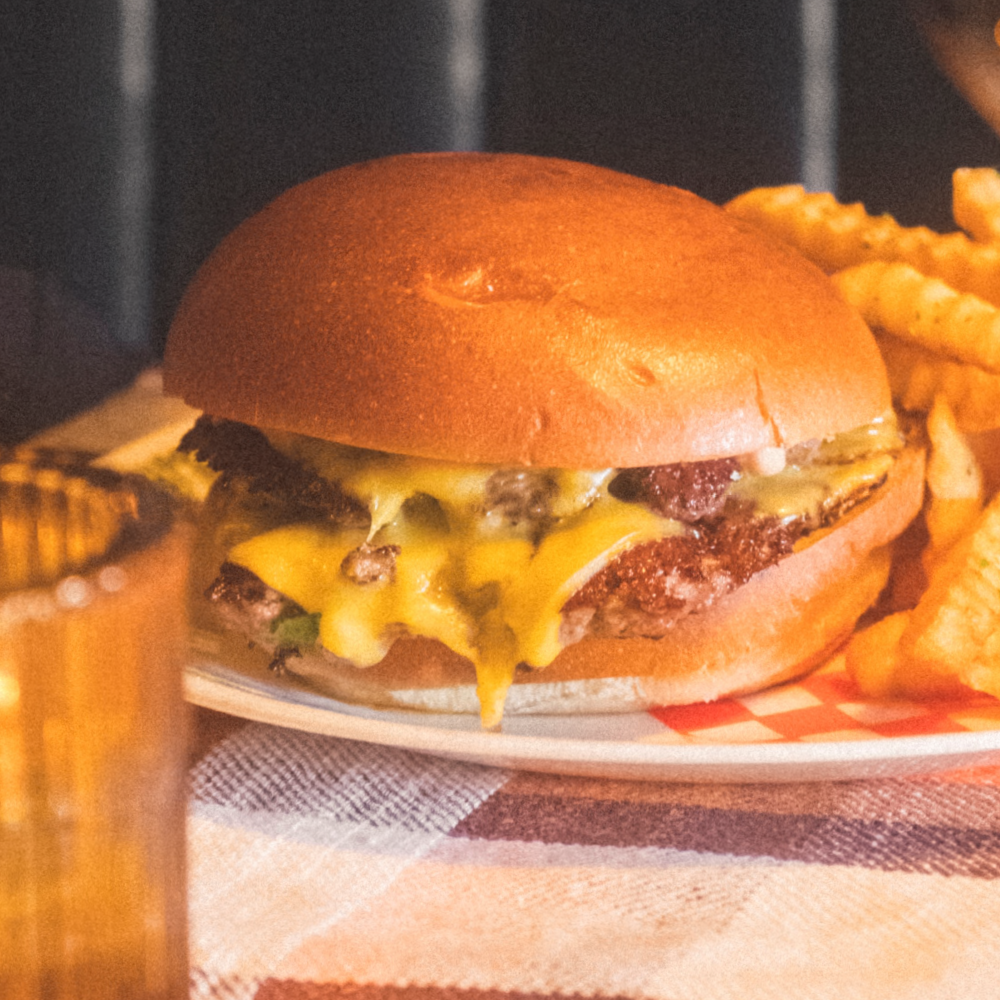 A Canadian Beef Patty, Tomato & Charred Onion Relish, American cheese, and Skinny’s Burger Sauce served on a Brioche Bun.
