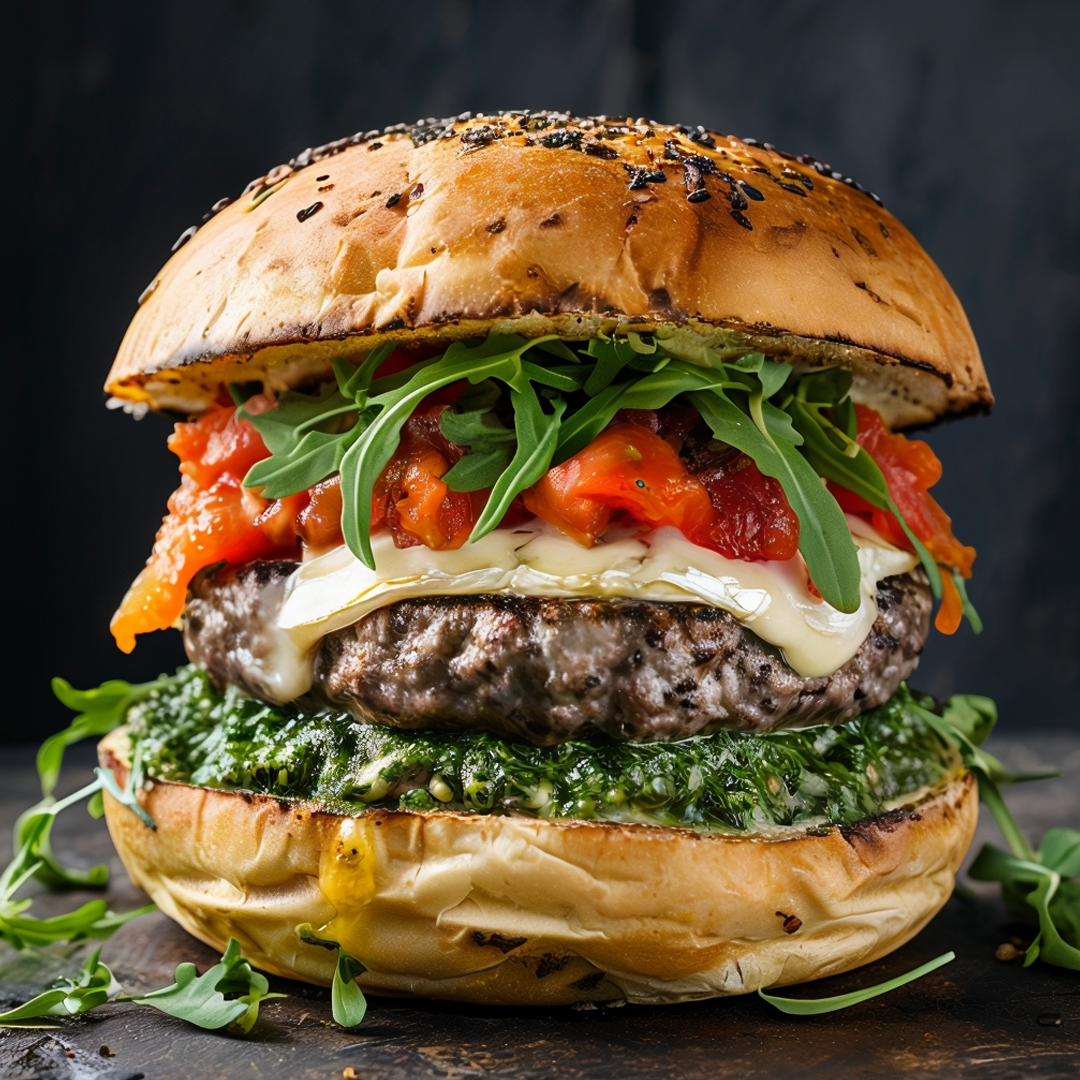 A 6 oz Springford Farms Beef Patty, Little Qualicum Brie, Peperonata, and Arugula Pesto Aioli served on a Potato Bun.