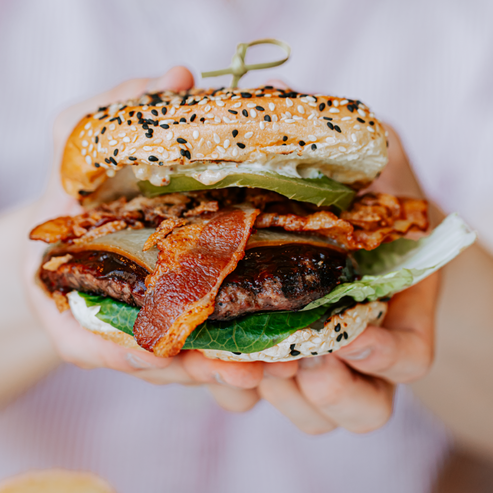 A Prairie Ranchers Beef Patty, Cheddar Cheese, Local Bacon, Crispy Onion, Lettuce, Tomato, Pickles, H2 Burger Sauce and Whiskey BBQ Sauce served on a Sesame Brioche Bun.
