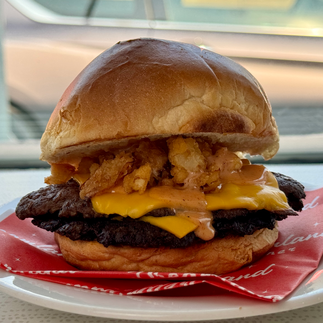 Two 3 oz Canadian Beef Patties, American Cheese, In-House Crispy onions, and Secret Sauce served on a Grilled and Garlic Buttered Gunn's Bakery Tropical Brioche Bun.