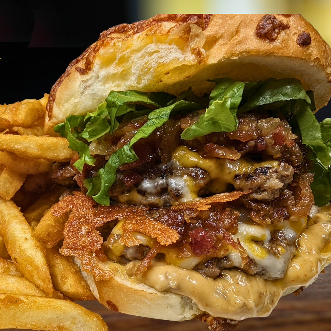 A Grilled Canadian Beef Patty, Local Cheddar and Mozzarella Cheeses, House-Made Aioli, Lettuce, and Maple Bacon Jam served on a Toasted Bun.