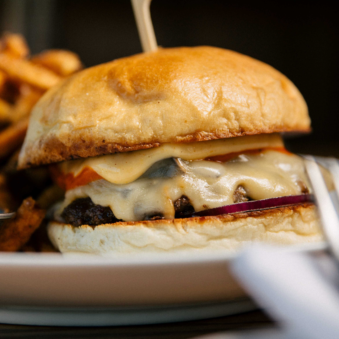 A Canadian Brisket + Chuck Patty, Smoked Gouda, Sautéed Mushroom + Onion, Sweet Pepper Relish, Shaved Red Onion, Romesco Ketchup, and Smoked Aioli served on a Toasted Bun.