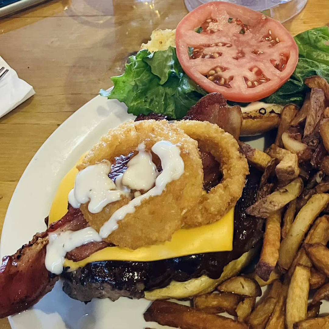 A Canadian Beef Patty, Lettuce, Tomato, BBQ Sauce, Cheddar Cheese, Onion Rings, Pickles, Bacon, and finished with Ranch Dressing served on a Classic Bun.