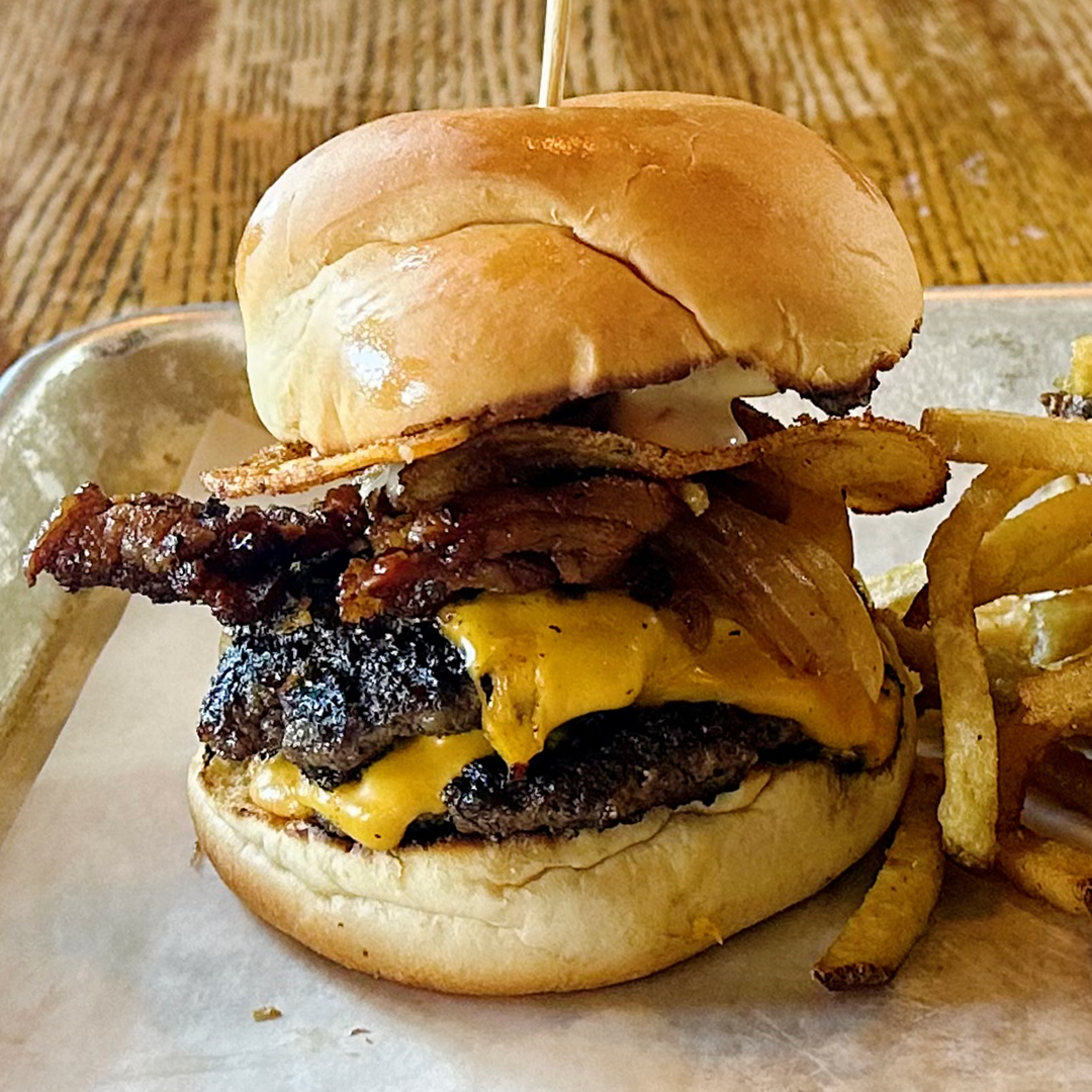 Two Brazen Canadian Beef patties, Smoked Brazen Burger Sauce, Chili Kettle Chips, Pineapple Salsa, Jalapeño Bacon, Cheese and Sautéed Onions served on a Toasted Bun.