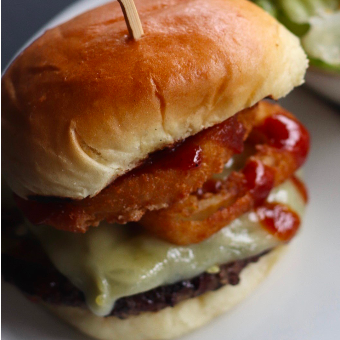 A 6 oz. House-Made Canadian All-Beef Patty topped with Aged White Cheddar, Pickled JalapeƱo, BBQ Sauce, and Onion Rings served on a Stone Crock Bakery Bun.