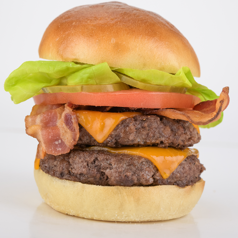 Two Seasoned Beef Patties topped with Double Cheddar Cheese, Bacon, Lettuce, Tomato and Pickle.