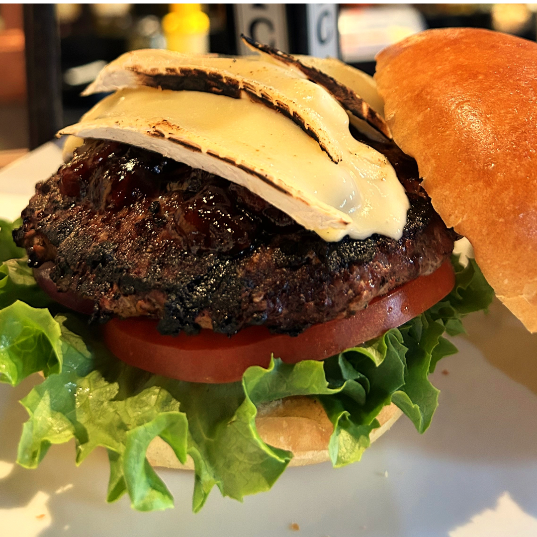 A 6.5 oz All-Beef Patty, Caramelized Onion Jam, Brie Cheese, Lettuce, and sliced Tomato served on a Brioche Kaiser Bun.