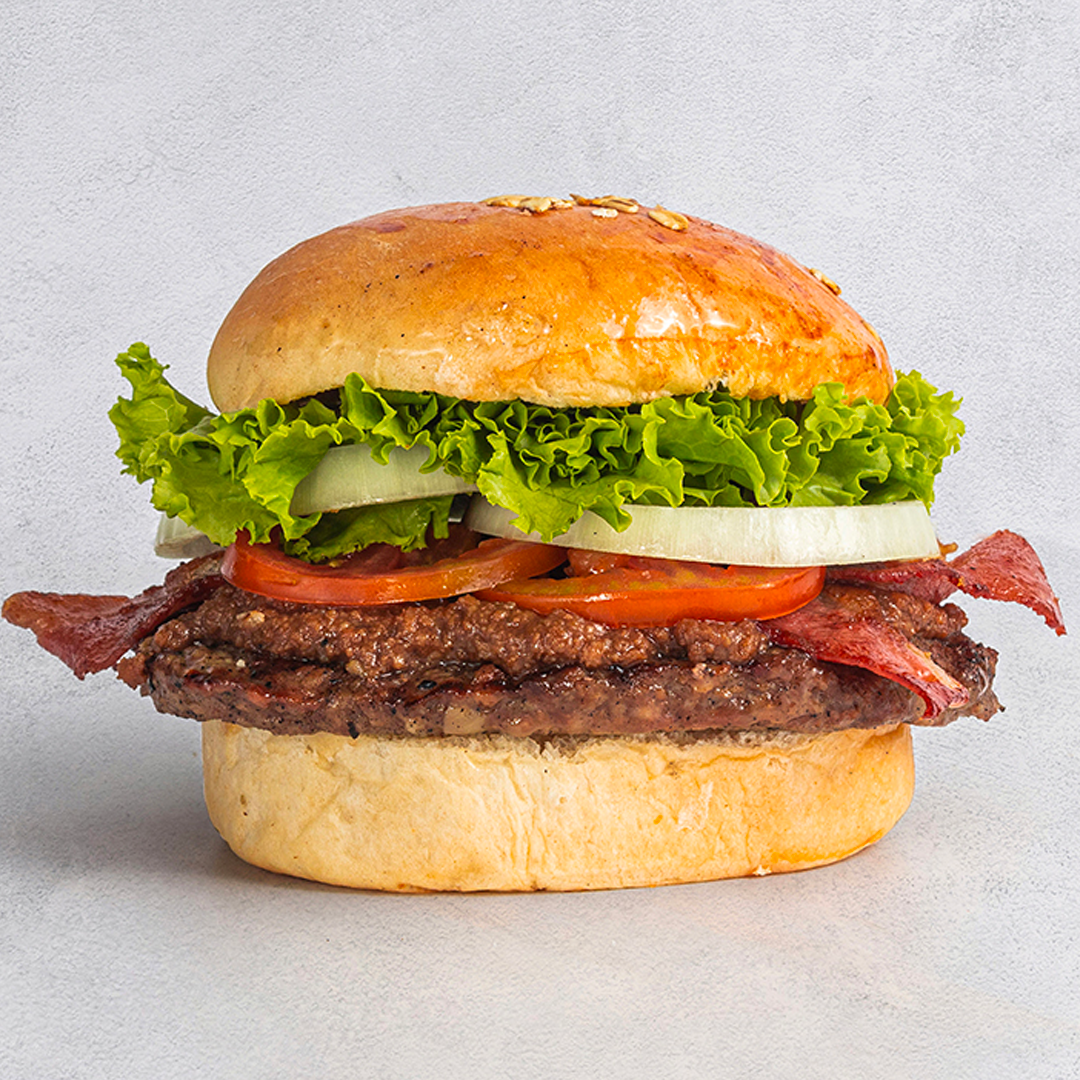 A 5 oz Flame-Grilled Canadian Beef Patty layered with Sweet and Salty Bacon Jam, Crispy Bacon, Fresh Lettuce, and Tomato served on a Soft Brioche Bun.