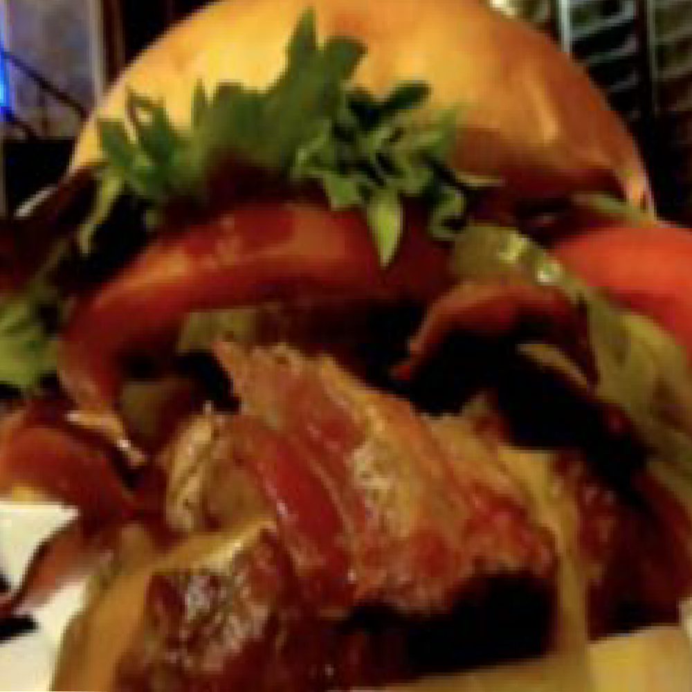 An 8 oz Grilled Beef Patty topped with Goat Cheese, Bacon, Caramelized Onions, Lettuce, Tomato, and Pickle.