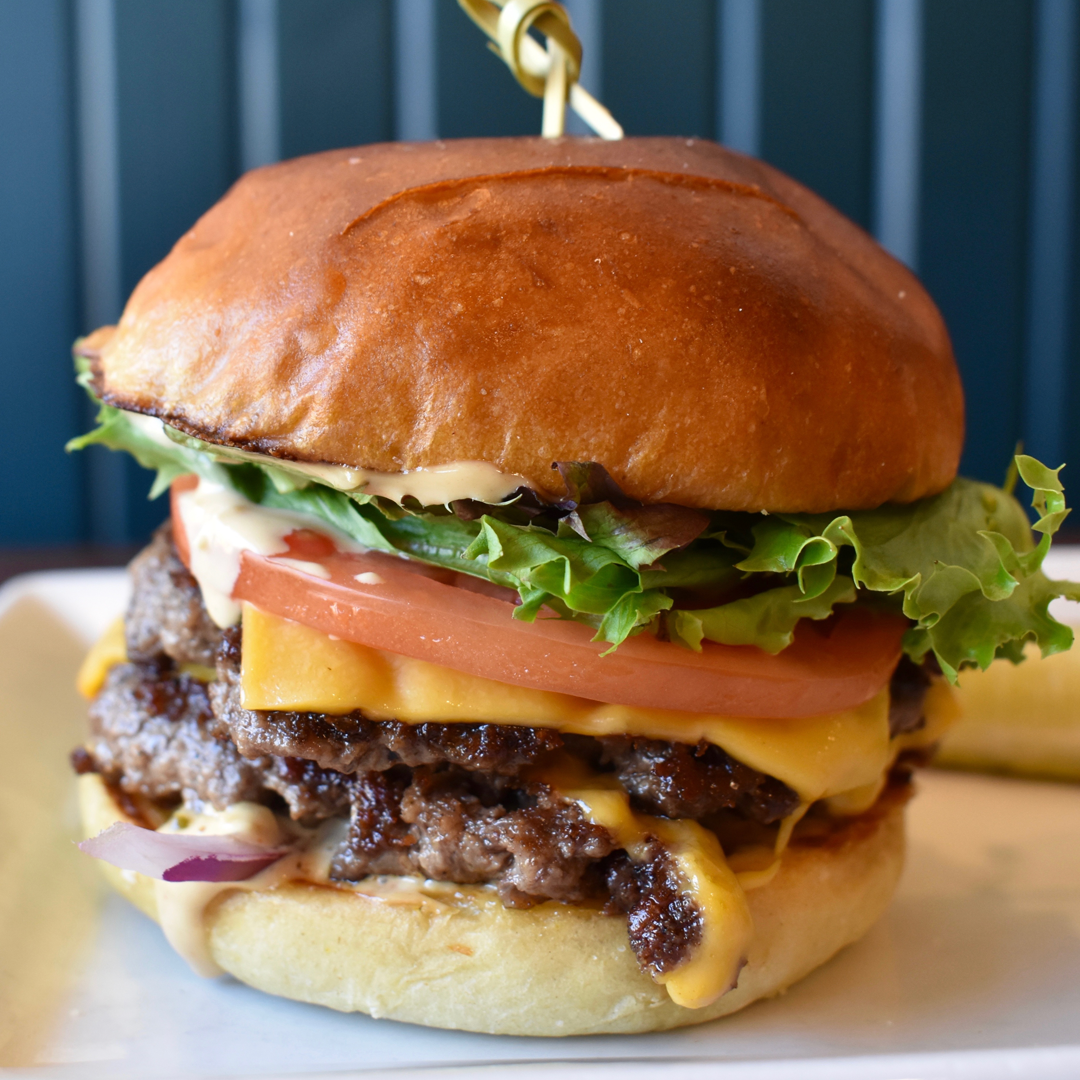 Two 4 oz Fresh Canadian Beef Patties, American Cheese, Awesome Sauce, Red Onion, Tomato, and Greens served on a Toasted Bun.