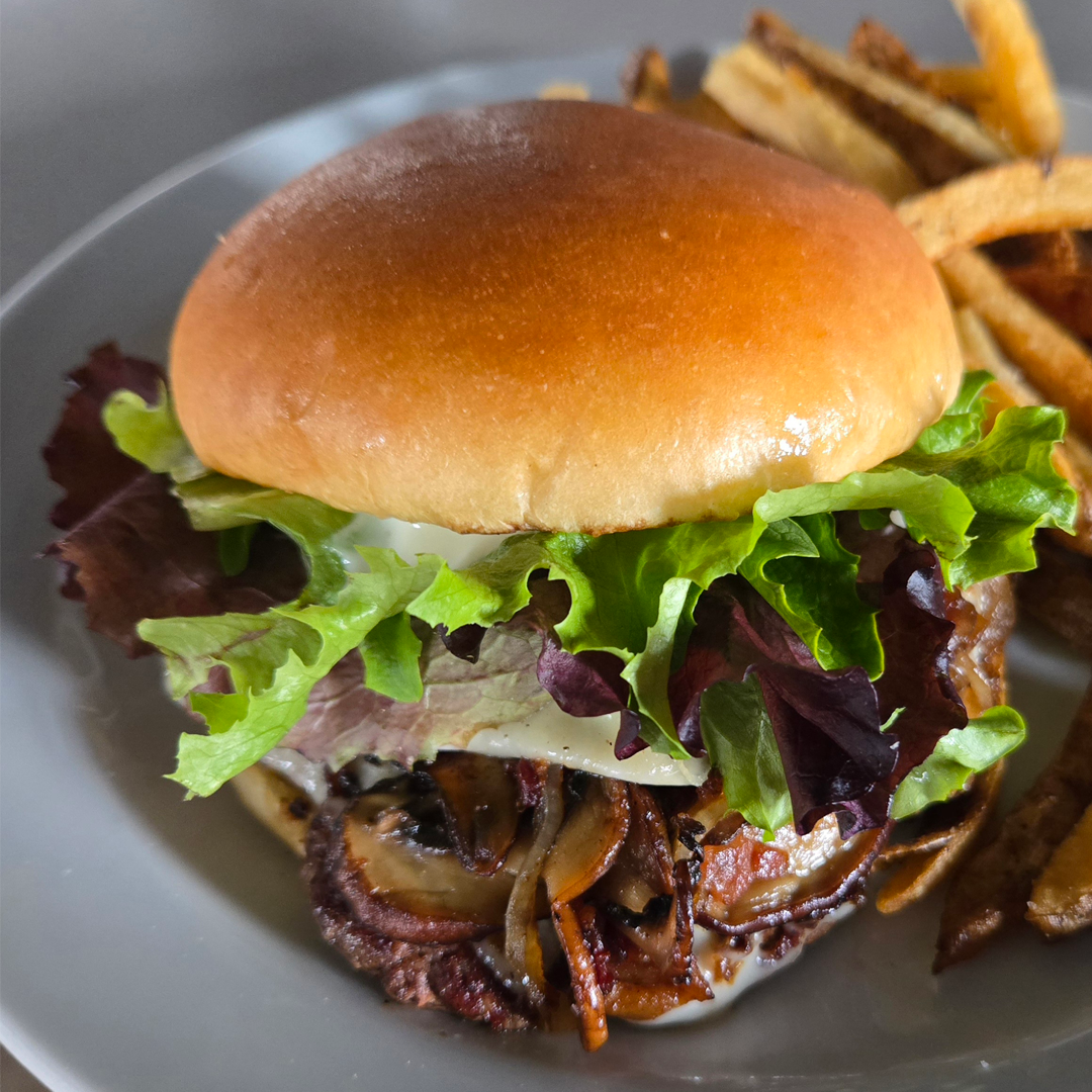 A Classic House-Made 5 oz Smash Canadian Beef Patty, Sautéed Wild Mushrooms, Swiss Cheese, Bacon Jam, Roasted Garlic Aioli, and Mixed Greens served on a Toasted Brioche Bun.