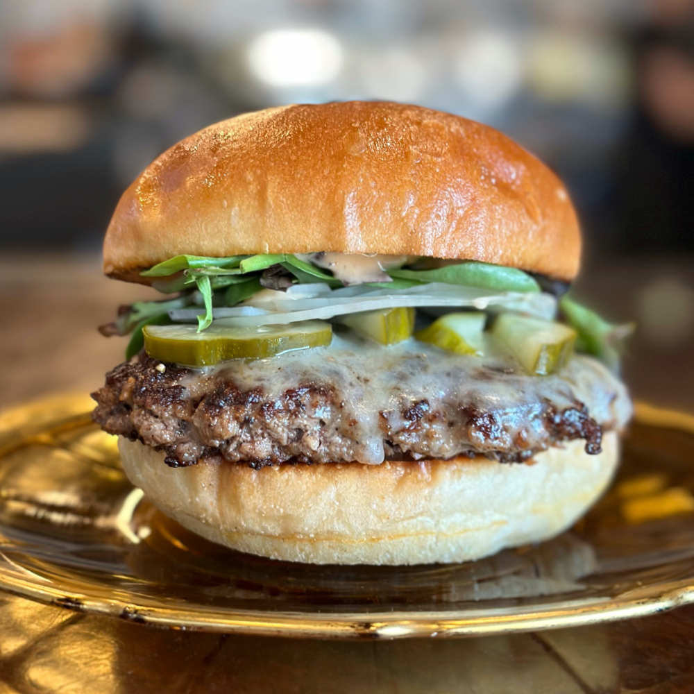 A Blended Prime Rib Beef & Pork Belly Patty, Cheddar Cheese, Lettuce, Onion, Pickles, and Special Sauce.