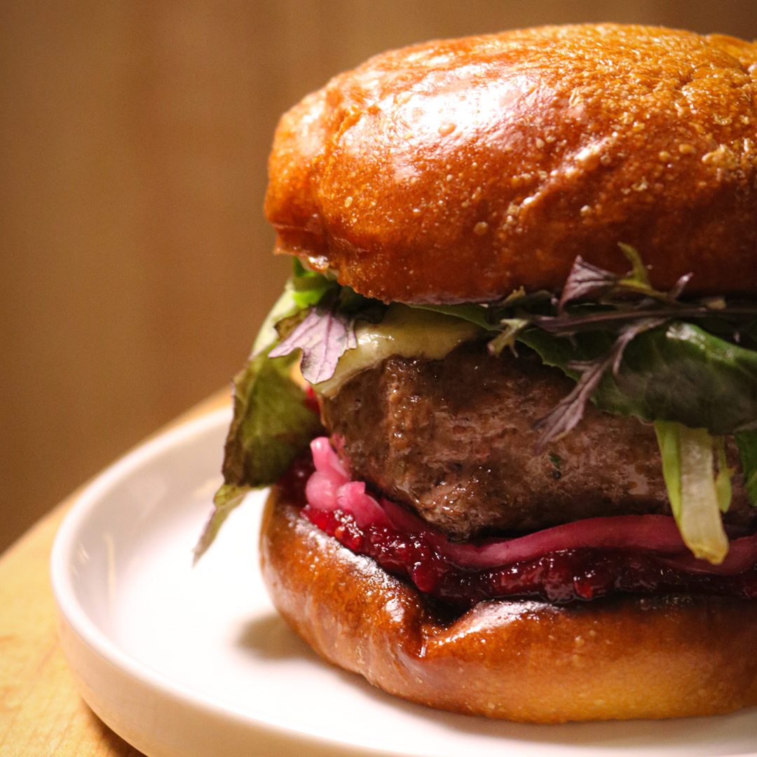 A Short Rib-Stuffed Canadian Beef Patty, Iceberg Lettuce, Garlic Aioli, Beet Chutney, Ontario White Cheddar Cheese, and Pickled Onions served on a Milk Bun.
