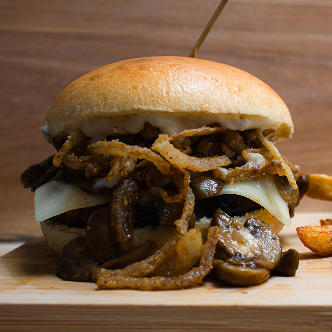 A Grilled All-Canadian Beef Patty, Sautéed Mushrooms, Melted Swiss Cheese, and Crispy Onion Straws, all drizzled with a rich Garlic Aioli served on a Brioche Bun.