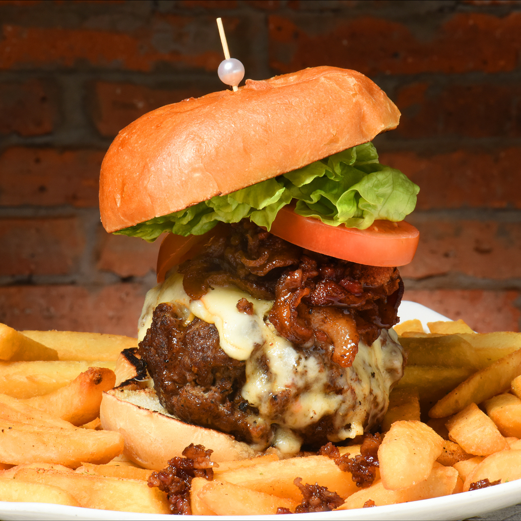 Our Secret Recipe Hand-Pressed Burger Patty, Bacon Strips, House-Made Maple Bacon Jam, Empire Cheese Whiskey Mustard Cheddar Cheese, Lettuce and Tomato served on a Toasted Bun.
