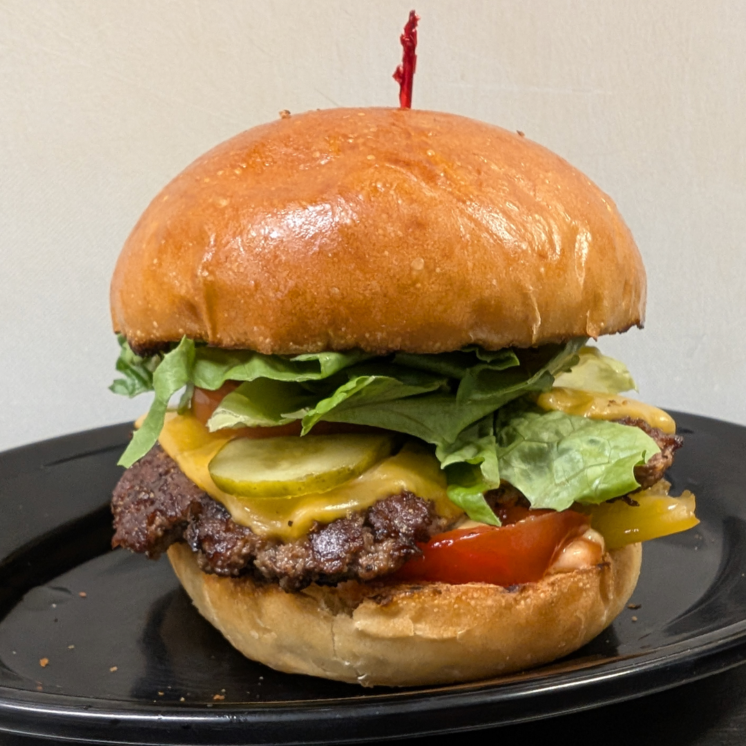 A 5.4 oz Smashed Canadian Beef Patty topped with Lettuce, Tomato, Pickle, Banana Peppers, Chipotle Mayo and Hot Sauce served on a Toasted Bun.