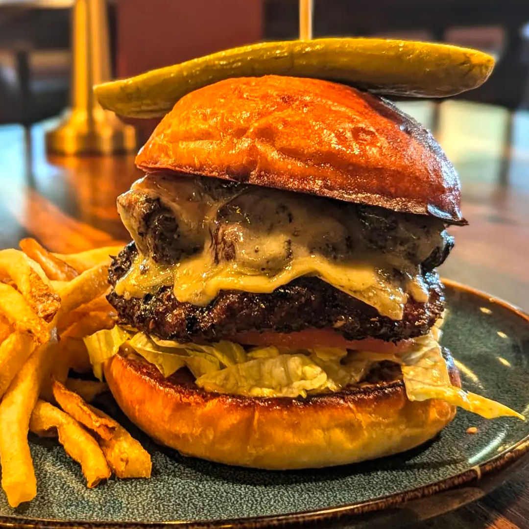 An Ontario Beef Patty, Locally-Grown Wild Mushrooms, Gruyere Cheese, House-Made Pickles, Lettuce, Tomato, Grilled Red Onion, and Truffle Oil served on a Brioche Bun.