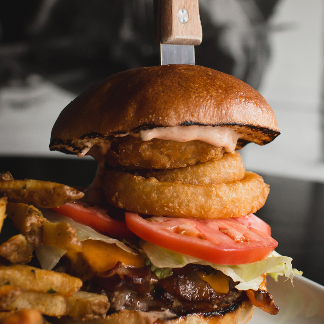 A 6 oz Canadian Beef Patty topped with our House-Made Whiskey BBQ Sauce, Smoked Bacon, Cheddar Cheese, Fried Onion Rings, Chipotle Aioli, Lettuce, and Tomato served on a Toasted Brioche Bun.