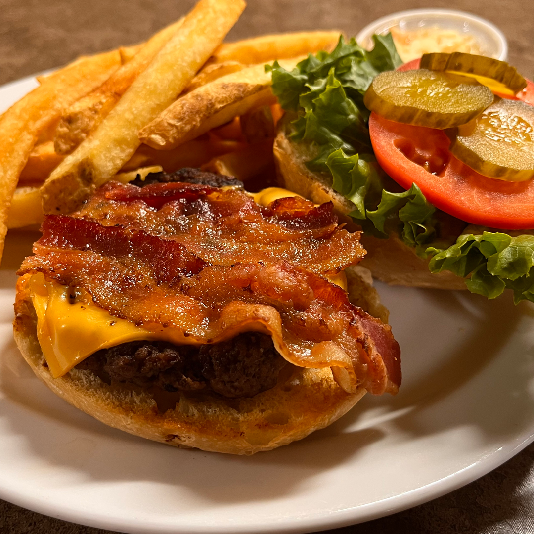 A 5 oz PEI Beef Patty, Cheddar Cheese, Bacon, Lettuce, Tomato, and Pickle served on a Gourmet Onion Bun.