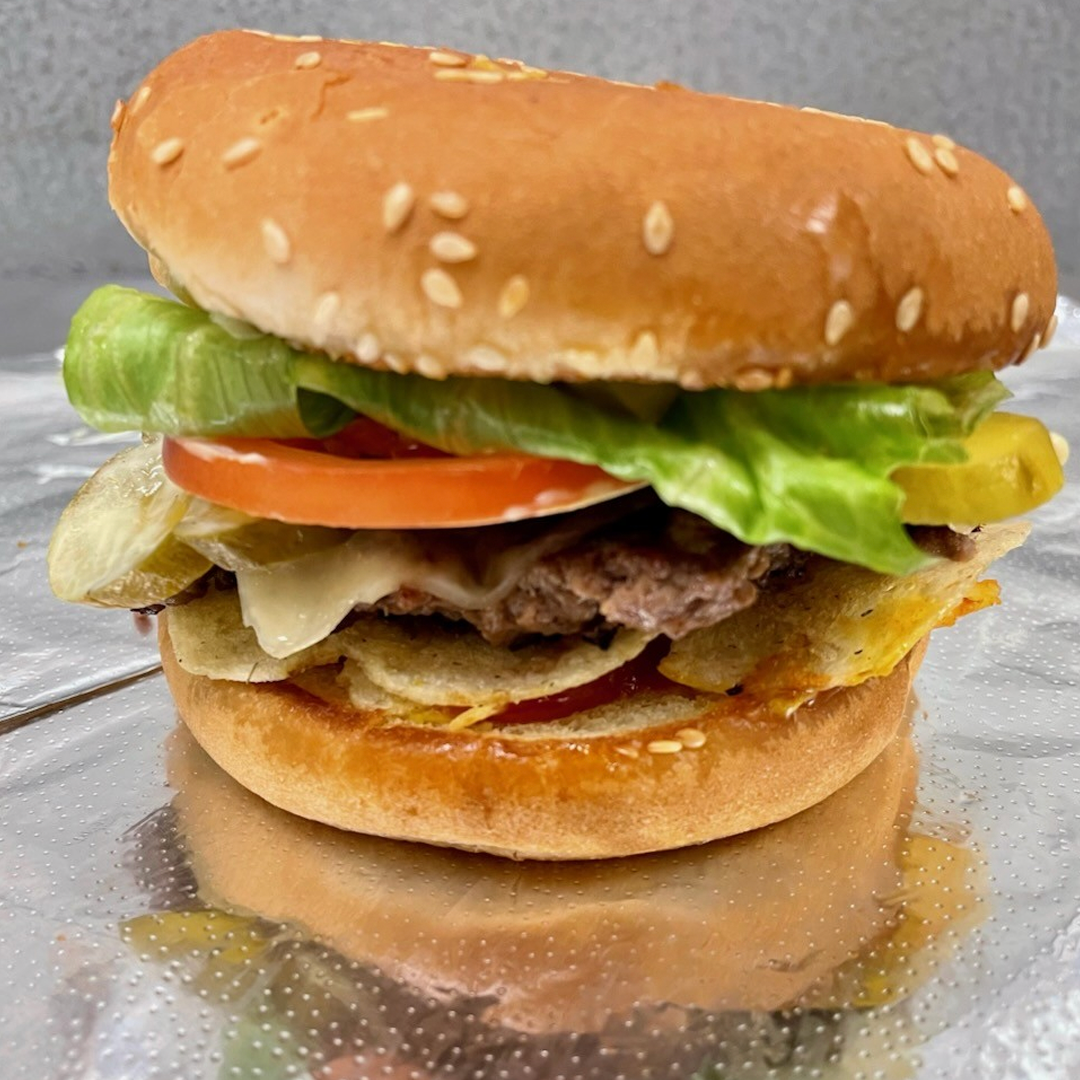 A 3.5 oz PEI Beef Patty, COWS Creamery Extra Old Cheddar, Dill Mayo, Lettuce, Dill Pickles, Tomatoes, Spud Island Chips, Ketchup and Mustard served on a Buttered and Toasted Bun.