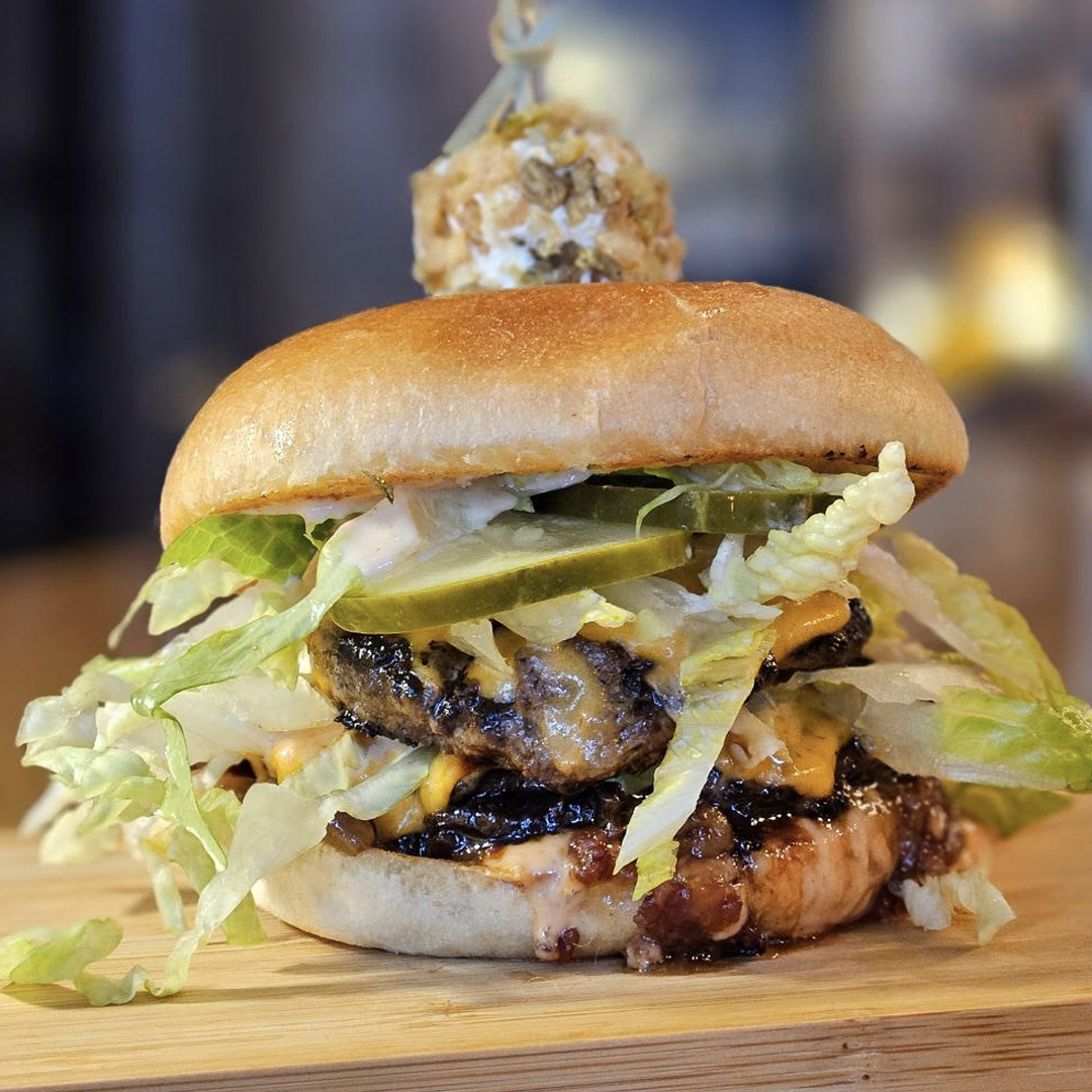 Two PEI Beef Patties, Cheddar Cheese, Bacon Jam, Lettuce, House Burger Sauce, and Pickles served on a Brioche Bun garnished with a Crispy JalapeƱo and Onion-Wrapped Goat Cheese Topper.