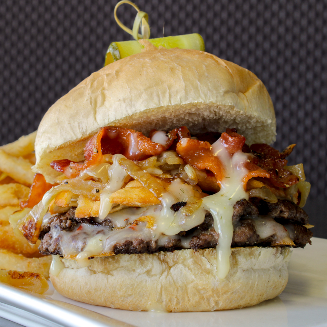 Two Canadian Beef Patties, Pepper Jack Cheese, Sauteed Onions, Pig Candy, Honey Dill Sauce, and two 3-Cheese Perogies served on a Homemade Hamburger Bun garnished with a Pickle Slice.