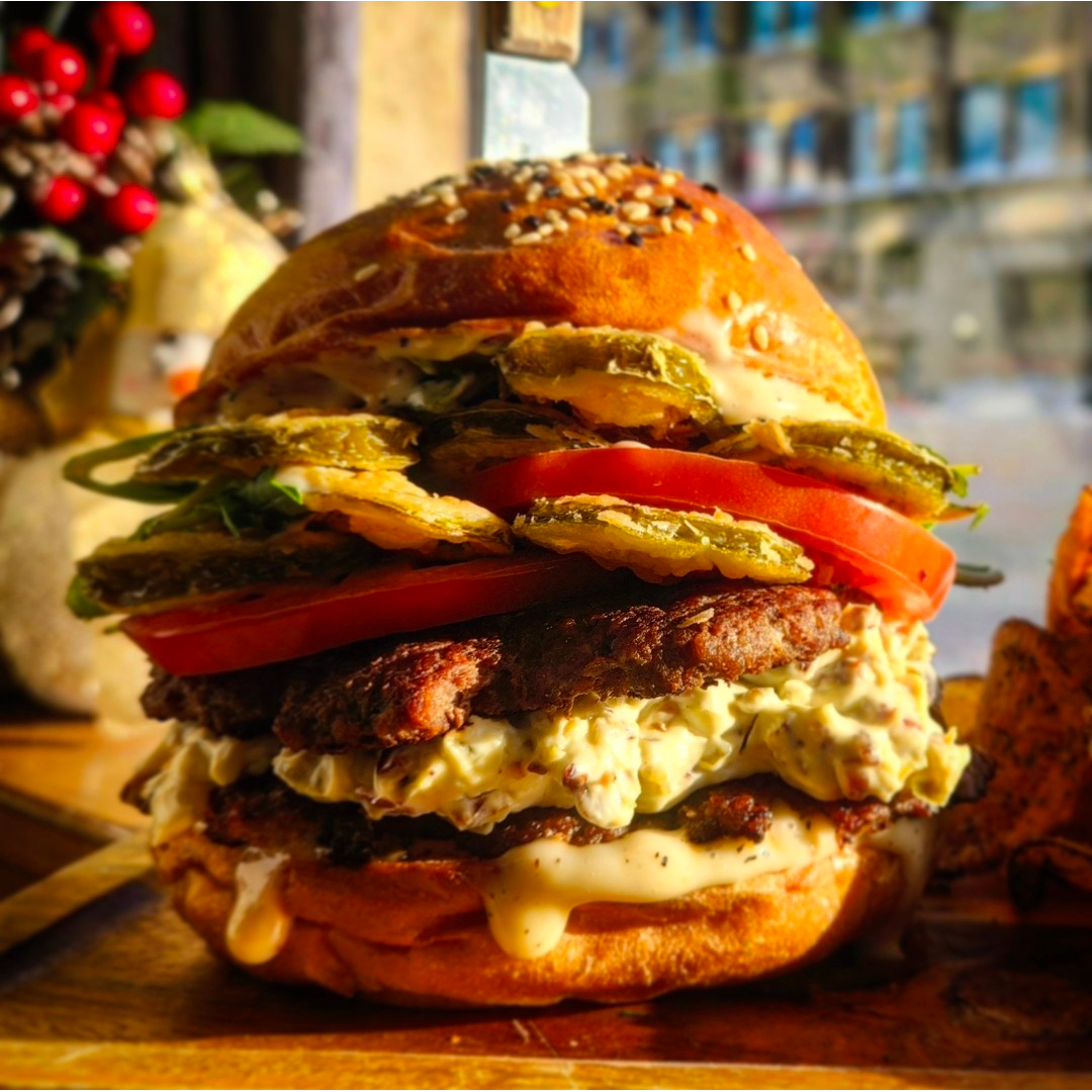 Two Canadian Beef Patties stuffed with House Jalapeño Popper Cream Cheese, Roasted Garlic Aioli, Fresh Tomato Slices, Crispy Pickled Jalapeños, and Peppery Arugula served on a Toasted Sesame Bun.