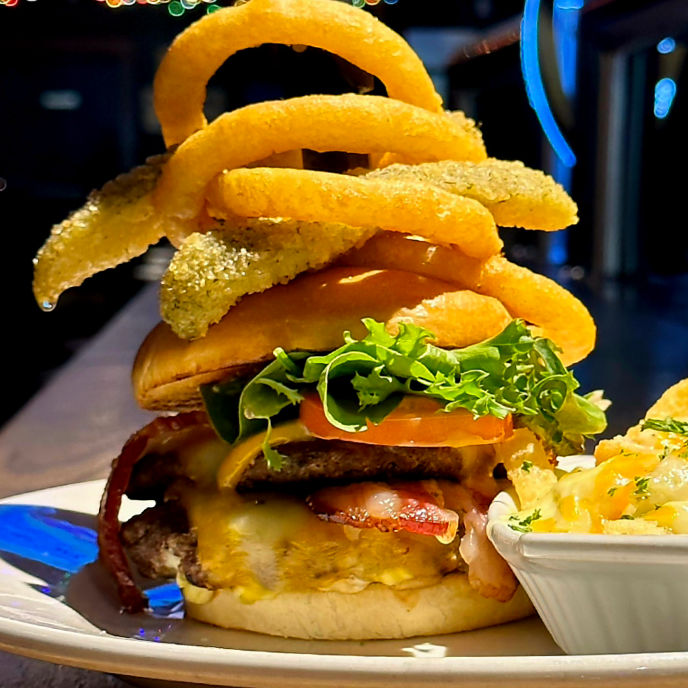 Double 5 oz AAA Beef Patties, Bacon, Cheddar Cheese, Lettuce and Tomato served on a Toasted Bun topped with Onion Rings and Deep-Fried Pickle Spears.