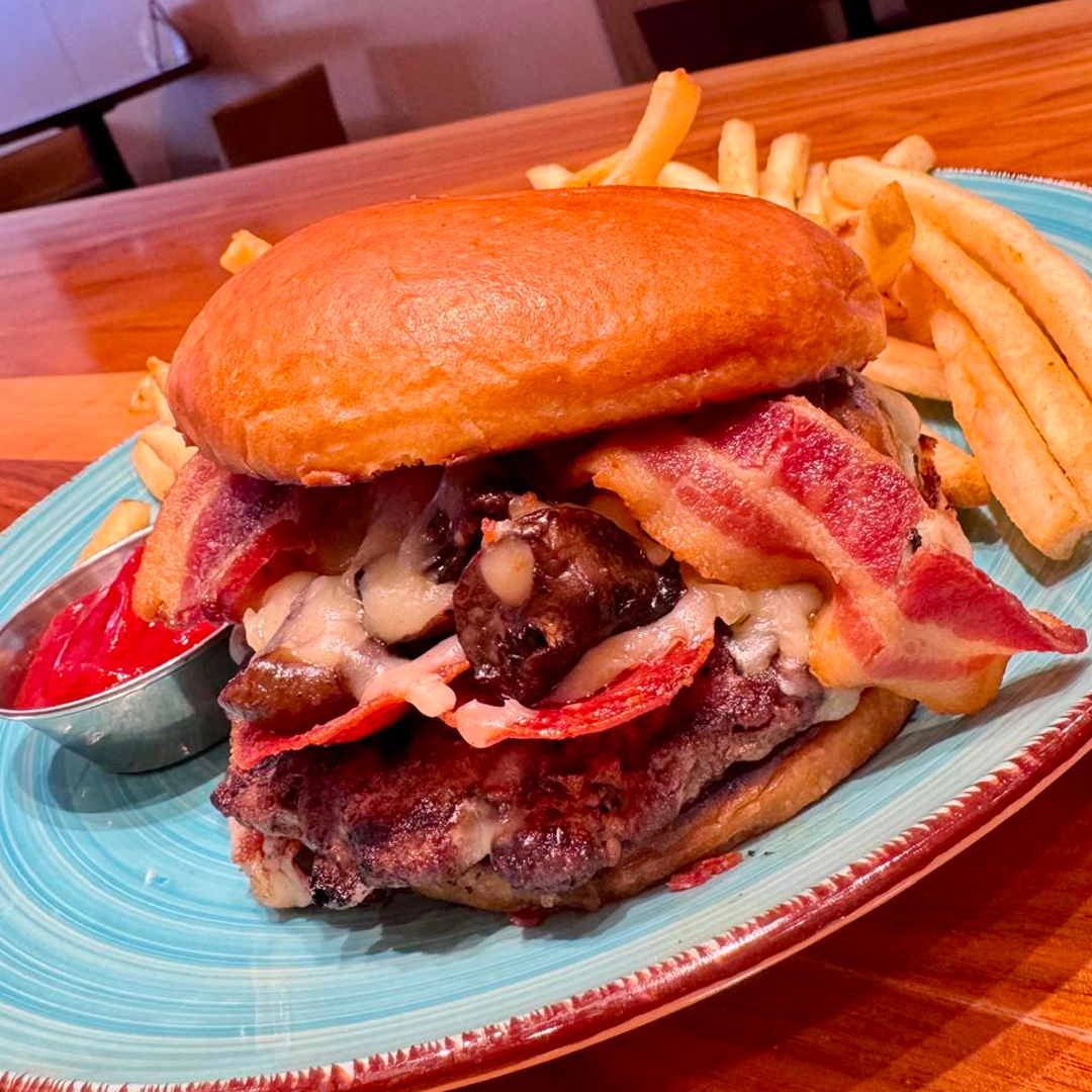 A Charbroiled 100% Canadian Beef Patty, House-Made Pizza Sauce, Roasted Herb Mushrooms, Pepperoni, and Canadian Bacon with Melted Mozzarella Cheese served on a Brioche Bun.